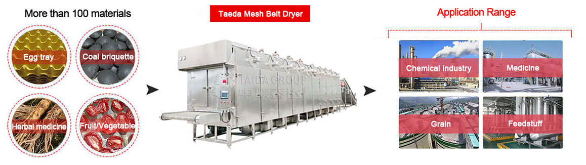 Taida DW series mesh-belt dryer can be widely applied to chemical industry, food, medicine, contruction material and electro industry. It is especilly suitable to dry slice, strip and pellet materials with good air permeability and breakable materials with low flash point. Aimed at different customers' demands, we can match corresponding crushing device, material distributing device and correcting device.