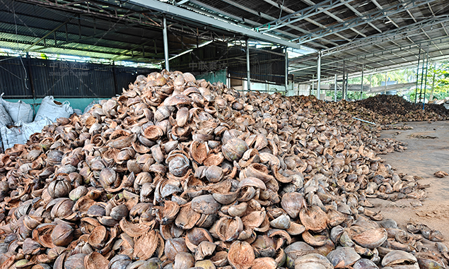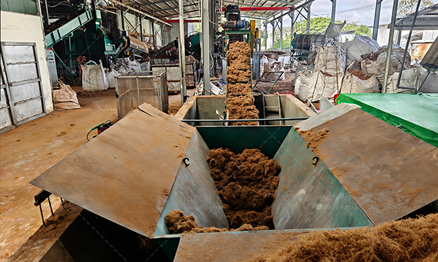 1、【Coconut shell Crushing System】① Coconut husks are sent to feeder by shovel and enters fiber opening machine. In this procedure, there are two types of materials produced: coco silk fiber and cocopeat. ② Screening machine will separate coco peat and coco silk fiber. Through collecting conveyor, cocopeat is transported to soaking tank and stay there for about 5-6 days before entering secondary desalting system. ③ Short coco silk fiber will be sorted out by collecting conveyor first. Then, qualified ones will enter packing procedure and be briquetted into blocks for easy storage and transportation.
