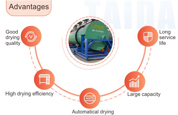 Taeda Digestate/biogas residue rotary dryer holds many advantages like flexible operation, low drying cost, wide application range, reliable performance, large capacity, less fuel consumption, high overload resistance and stable running. Wet materials can be dried quickly by exchanging heat with high temperature hot air. Design of Taeda pig manure dryer takes working margin into consideration. Even capacity is increased slightly, there is no need to change larger model equipment.