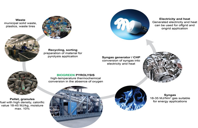 5. The whole device adopts non-condensable gas back combustion device developed by our company. There are some combustible gases which can not be condensated under normal atmospheric and normal temperature while the equipment is running. These gases will be burnt at the bottom of pyrolysis main furnace in waste gas back combustion system. Then, a great amount of thermal energy will be produced, which not only avoids pollution, but also saves fuels.