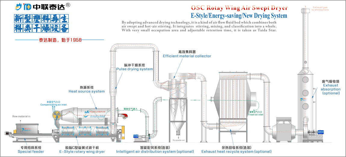 Taeda OSC-AST air swept plastic dryer’s working temperature can be adjusted in a certain range according to real demands. It can match with electricity, gas and oil as heating source. OSC-AST dryer can directly reduce plastic’s moisture to lower than 0.5% from 5%. Whole drying process is done in a continuous mode and output capacity can reach to 10t/h. Compared with traditional dryer, OSC-AST dryer consumes less labor force and its occupation area is only one third of common dryers.